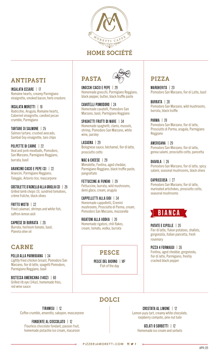 The menu at Moretti Caffe @Home Societe offers a thoughtful selection that blends classic Italian comfort with casual café fare. Whether you're stopping in for a morning cappuccino and filled croissant or settling down for a leisurely dinner featuring dishes like Rigatoni Alla Vodka or Pollo Alla Parmigiana, the food feels approachable and inviting.