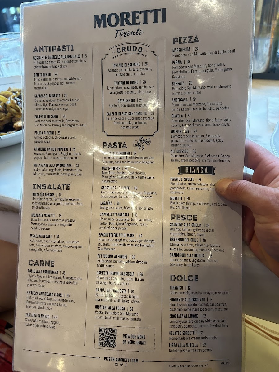 Throughout the day, you’ll find options that suit various moments—from light bites like the Insalata Moretti and smoked salmon bagel to heartier choices such as seafood pasta or a carefully prepared steak. The pizza selection ranges from traditional Margherita to more indulgent versions like the Burrata or 4 Formaggi, perfect whether you’re sharing with friends or enjoying a quiet meal solo.